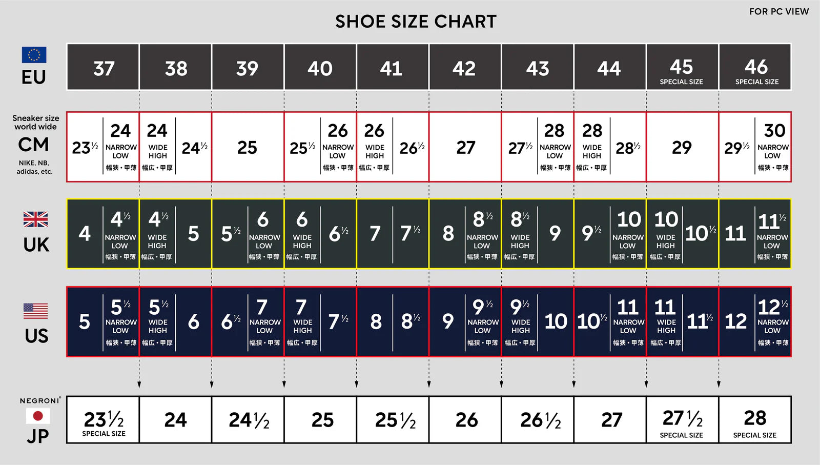 ネグローニのサイズは、一般的なスニーカーの cm 表記と比べてゆとりのある設計になっています。