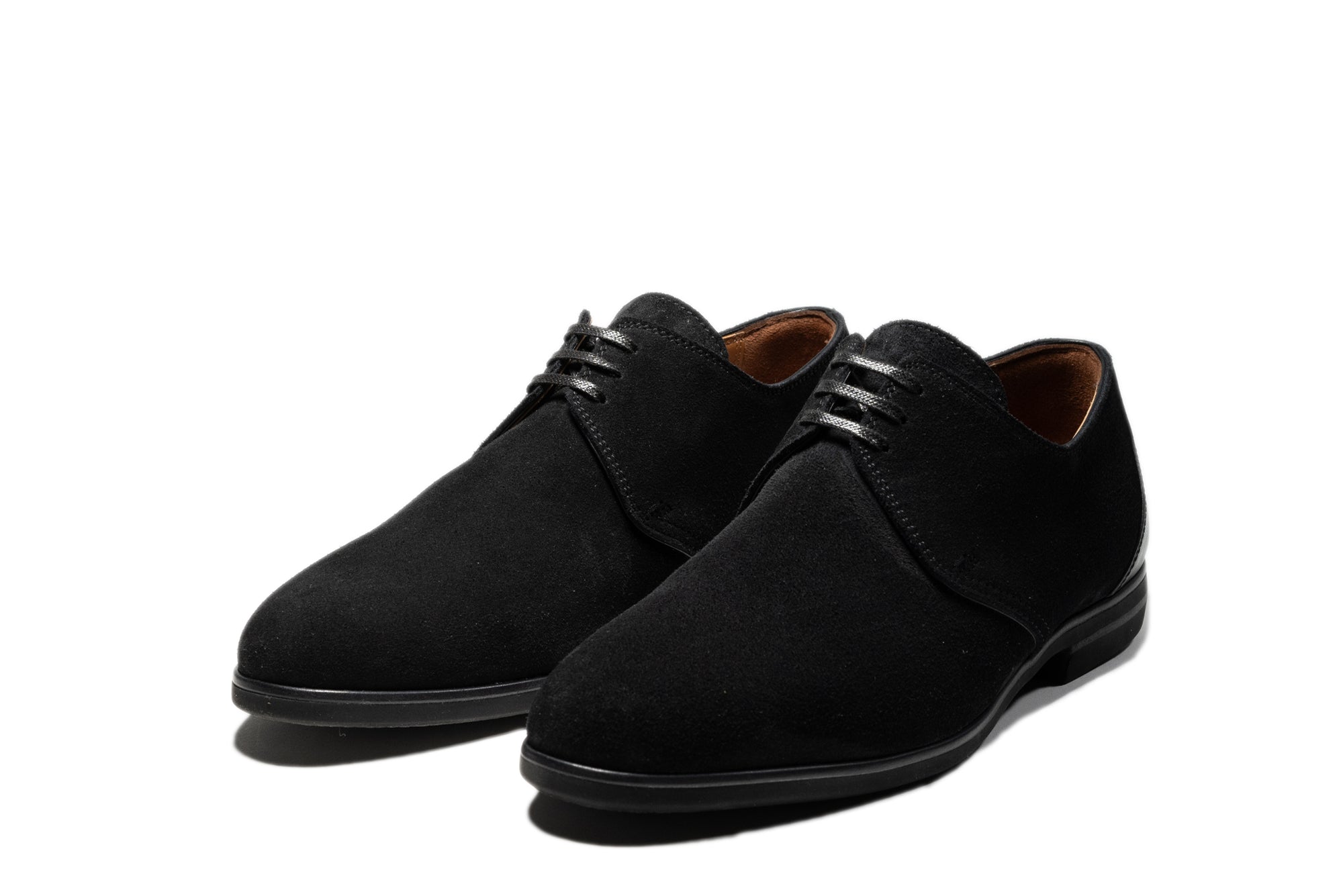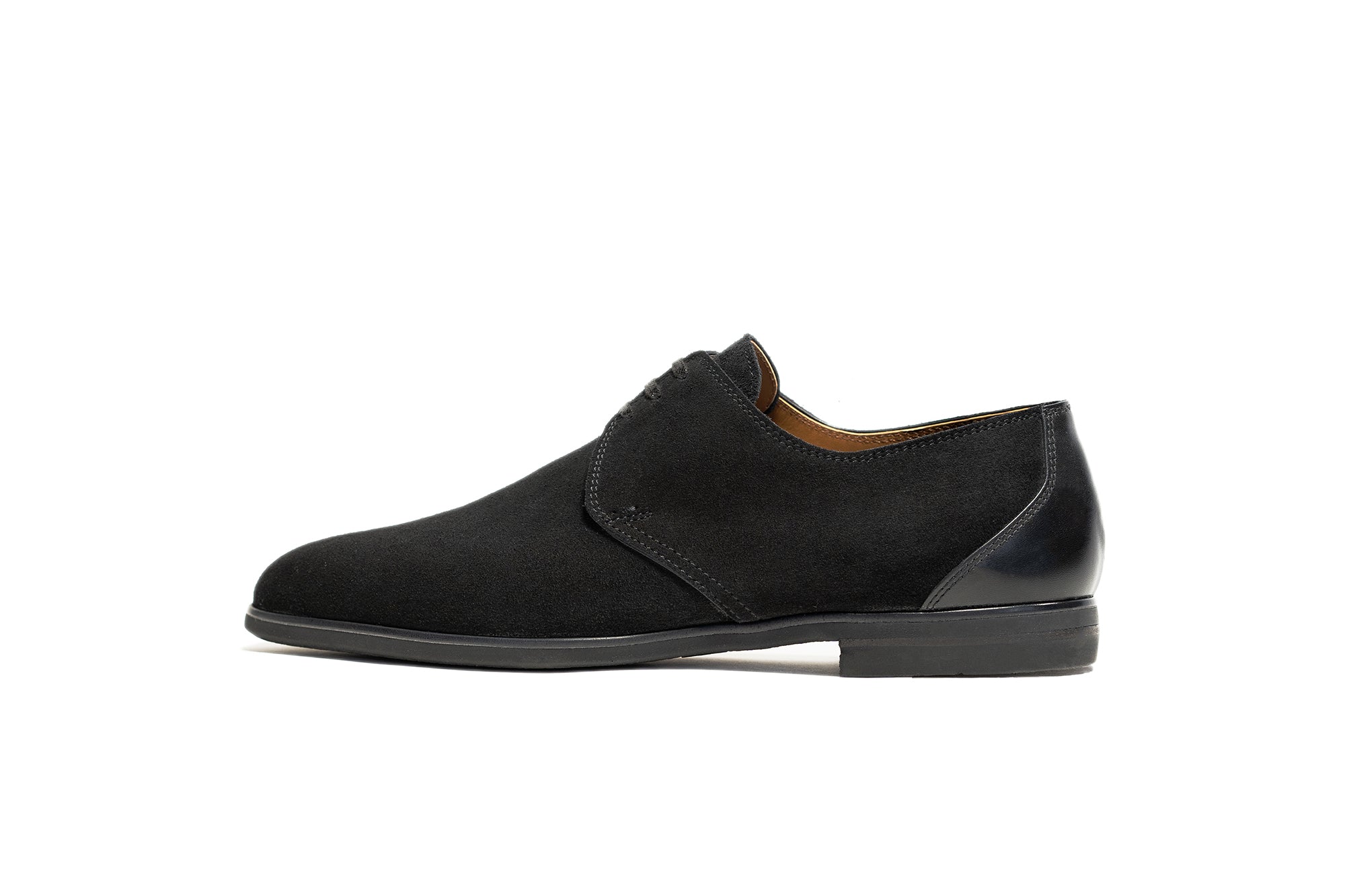アッパーには上質なスエードレザーを用い、端正なプレーントゥのシルエットにエレガントな雰囲気を与えています。パティーヌ染色されたレザーウェルトが手仕事ならではの深みを添え、クラシックな存在感を強調。アウトソールにはイタリア・ビブラム社製の超軽量 Gumlite を採用し、ドレッシーな外観の中に高い実用性を備えています。