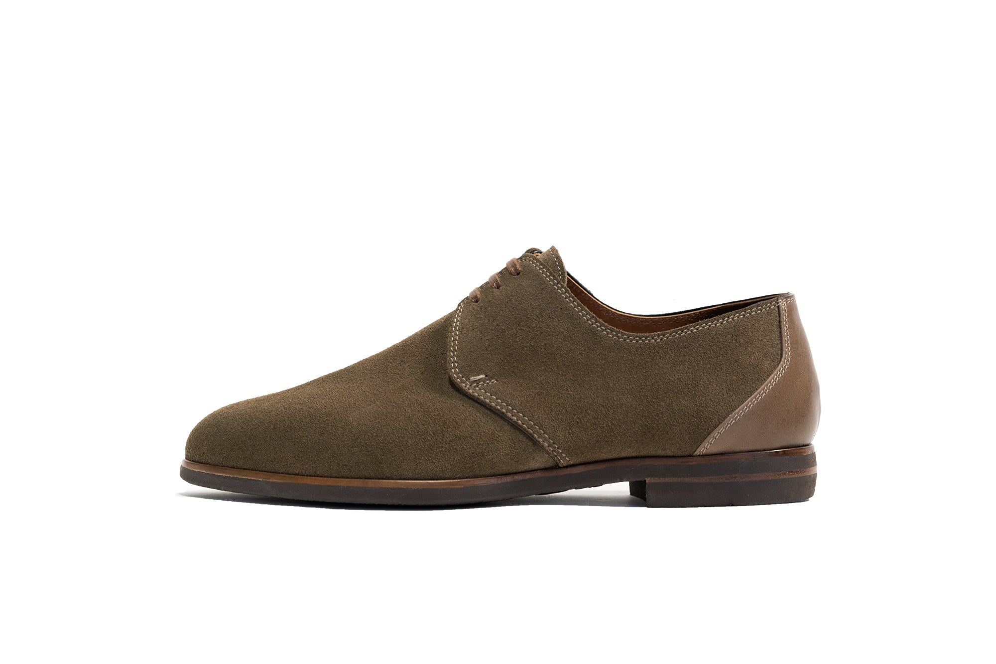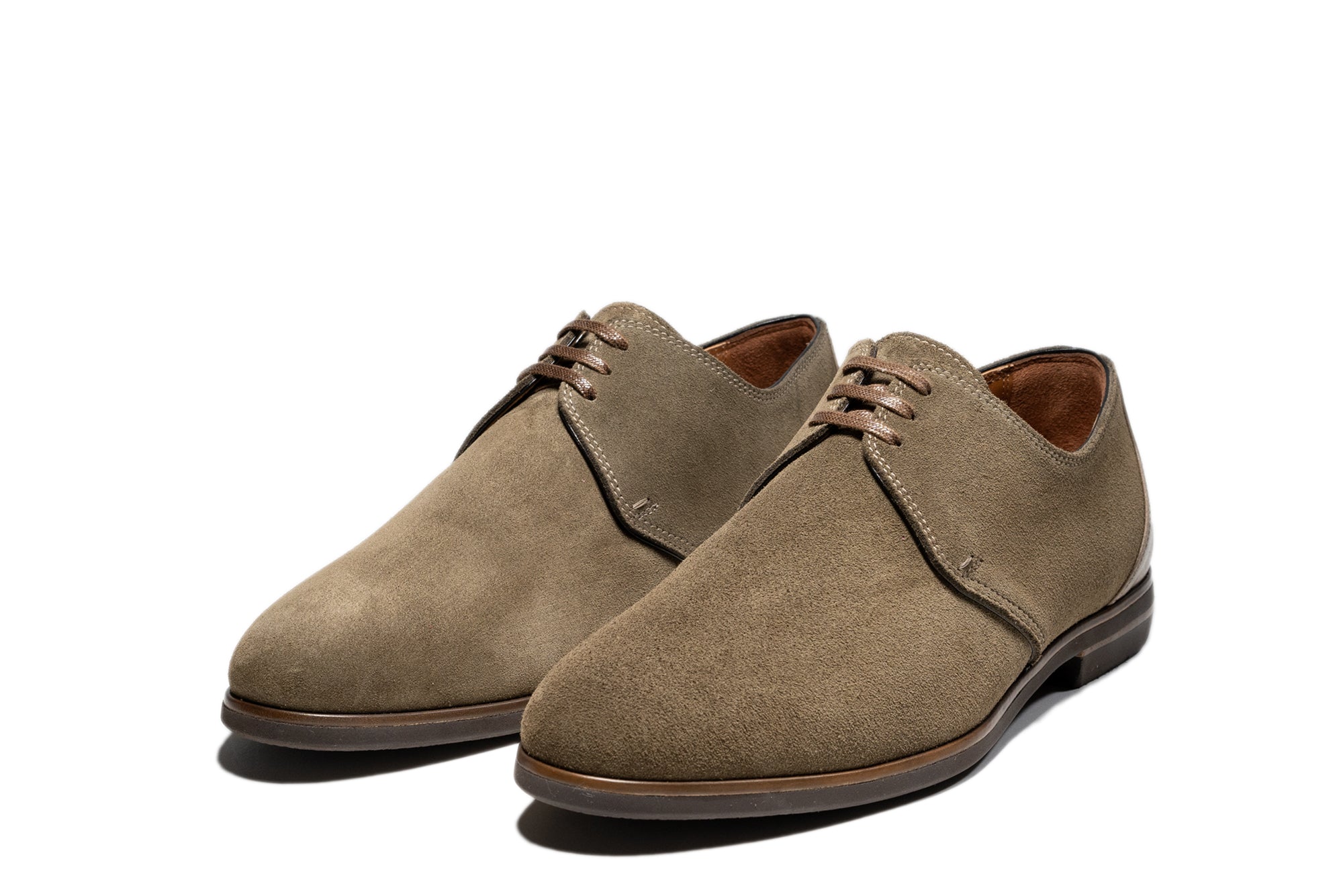 アッパーには上質なスエードレザーを用い、端正なプレーントゥのシルエットにエレガントな雰囲気を与えています。パティーヌ染色されたレザーウェルトが手仕事ならではの深みを添え、クラシックな存在感を強調。アウトソールにはイタリア・ビブラム社製の超軽量 Gumlite を採用し、ドレッシーな外観の中に高い実用性を備えています。